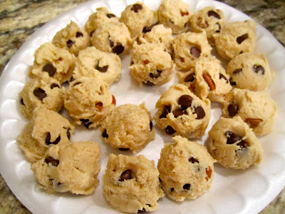 Blend in the flour until dough is well combined and smooth. Add in chopped pecans and chocolate chips (I used milk and semi-sweet)